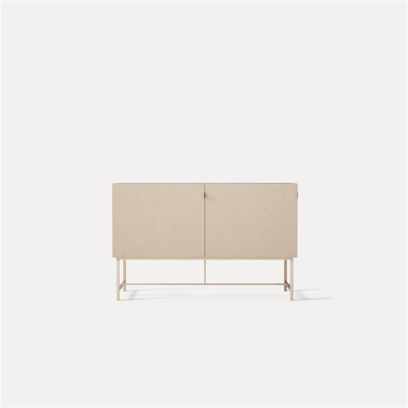 Storage cabinets of solid wood, with stone wool filling. Externally fully covered by fabric. Base of metal.